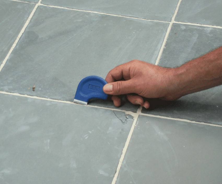 Для этого размачиваем мастику в швах при помощи воды. Для цемента и латекса она подойдет отлично. При использовании эпоксидной смолы в затирке придется применять растворитель. Для выскабливания крошки из швов нужен инструмент: расшиватель или шабер. Удаляем скребком аккуратно все содержимое шва, не повреждая плитку.