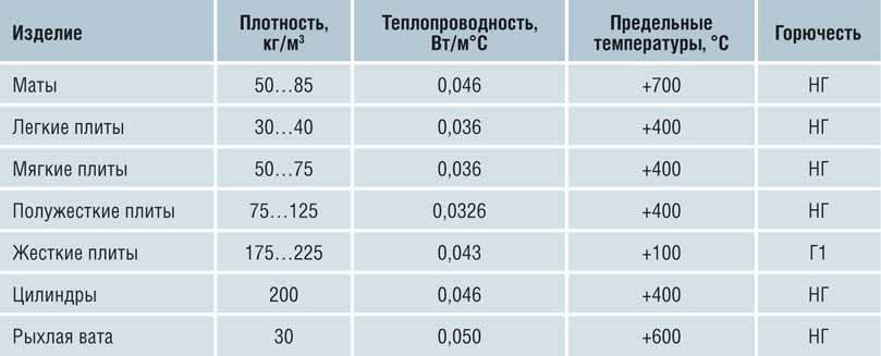 Таблица характеристик минеральной ваты