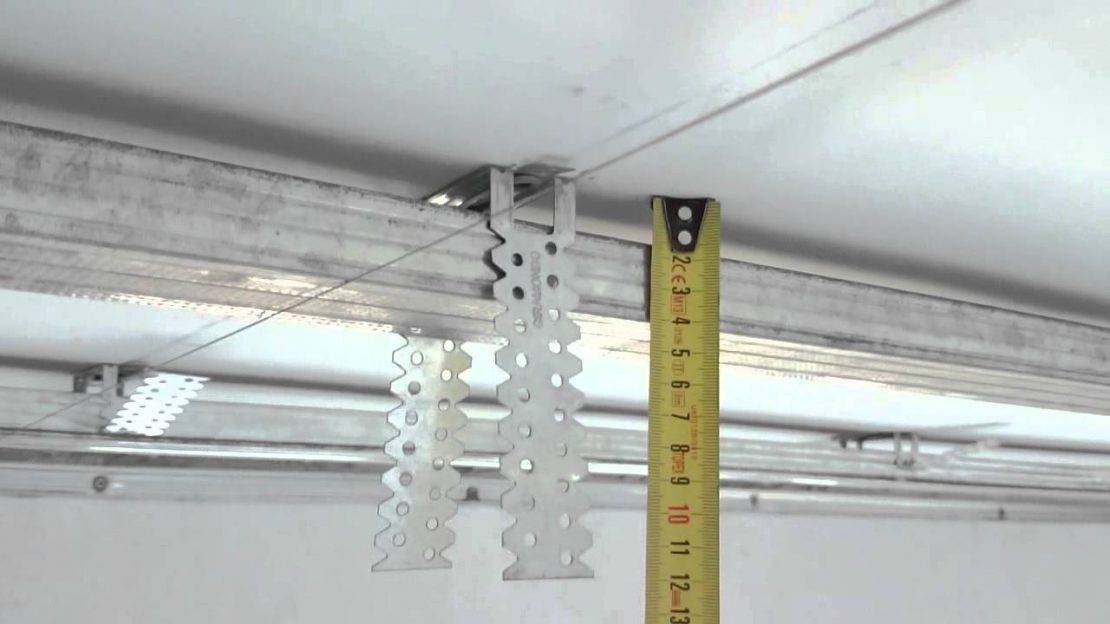 Они закрепляются дюбелями (их длина определяется в зависимости от толщины стены) радиусом 3 мм;на базовый обычный потолок фиксируется П-образный ленточный подвес из оцинковки;через каждые 50-60 см по размеченным контрольным линиям устанавливаются консоли.
