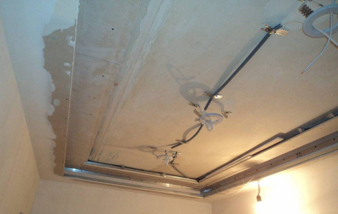 Теперь рассмотрим, как установить каркас и гипсокартон на потолок.