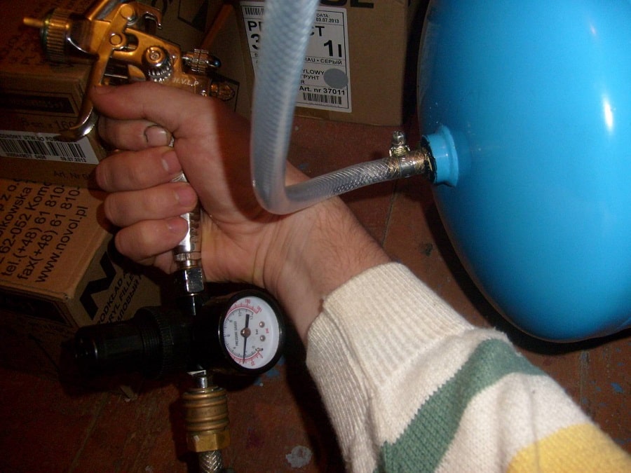 Этот параметр не всегда идеально подходит, поэтому в гидробаке предусмотрена регулировка. Для этого на корпусе установлен золотник для стравливания и подкачки воздуха. Давление внутри изменяется обычным манометром от автомобиля. При превышении расчетного показателя, воздух нужно спустить, а при снижении – накачать воздушную подушку насосом от автомашины.