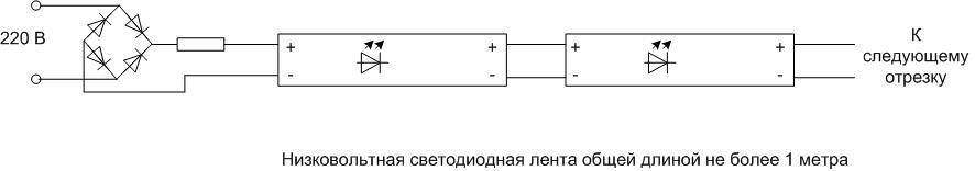 Если применяется несколько отрезков полотна общей длиной более 1 метра, их надо соединять параллельно. В противном случае проводники ленты не смогут выдержать общего тока системы освещения. Еще лучше рассчитать балласт для каждого отрезка раздельно. При необходимости замены пересчету будет подлежать только заменяемое полотно. Диодный мост должен с запасом выдерживать суммарный ток всех отрезков ленты.