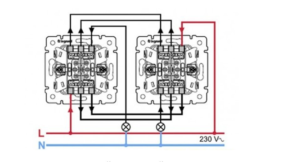 Подключение Legrand: схема проходного выключателя одноклавишного и двухклавишного