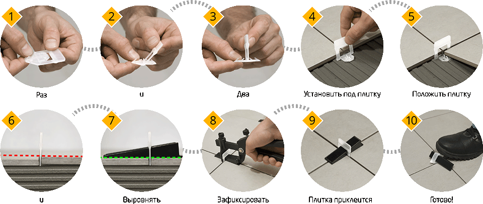 Т-образная подкладка фиксируется под две соседние плитки и выступает как дистанционный крестик, только дополнительно выравнивает края плитки. Распорка вставляется в данный элемент и затягивает его, дополнительно выравнивает плитки, создавая давление на них своей плоскостью. За счет большой ширины системы можно выравнивать одновременно 4 плитки в местах перекрещивания шва. Для установки распорок используется специальный инструмент – зажимные клещи. Удаляются распорки после высыхания клея простым сбиванием, но их основания остаются под плиткой.