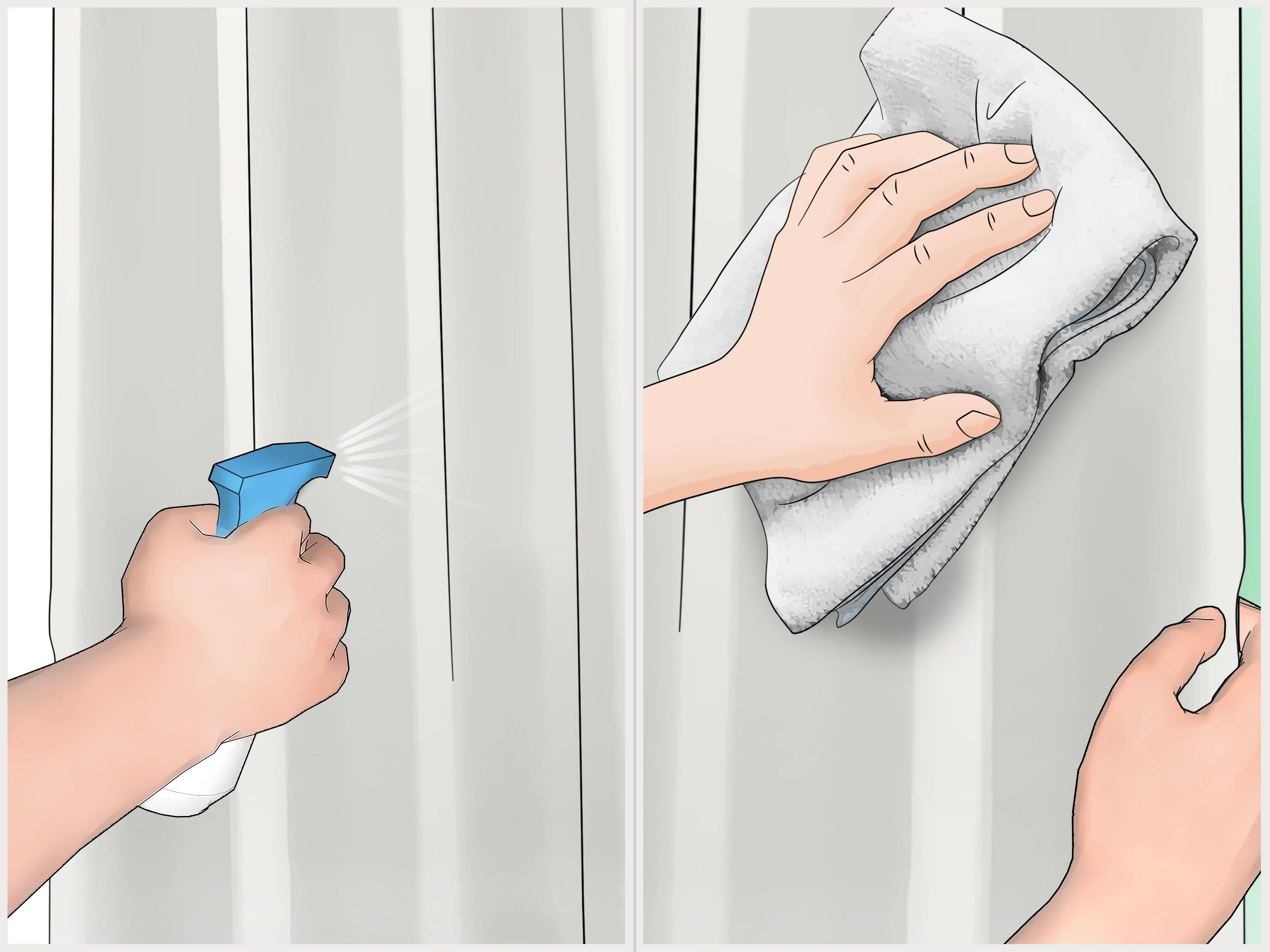 - Распылить чистящее средство по поверхности занавески.
