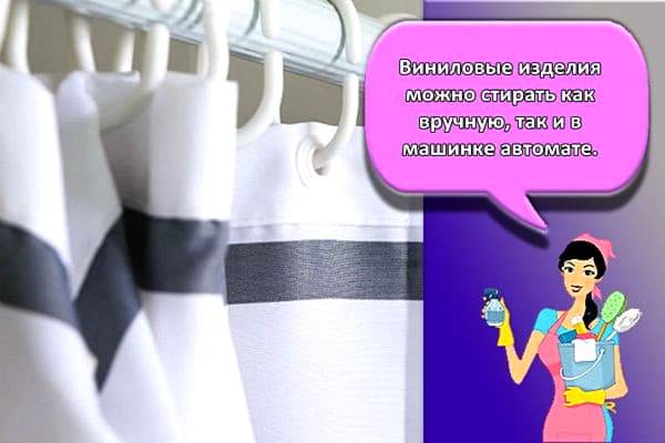Виниловые, текстильно-полихлорвиниловые шторки стирают аналогичным образом с махровым полотенцем, для лучшего контакта с моющим средством. Если не предполагается снятие колец, то изделия стирают в наволочке, во избежание порчи барабана.