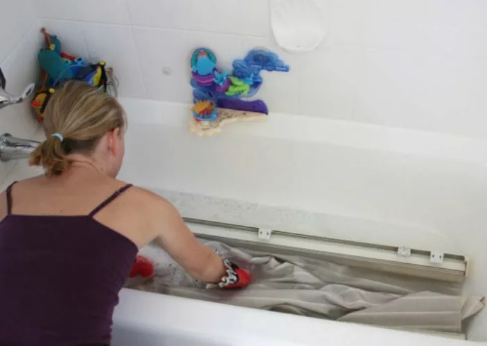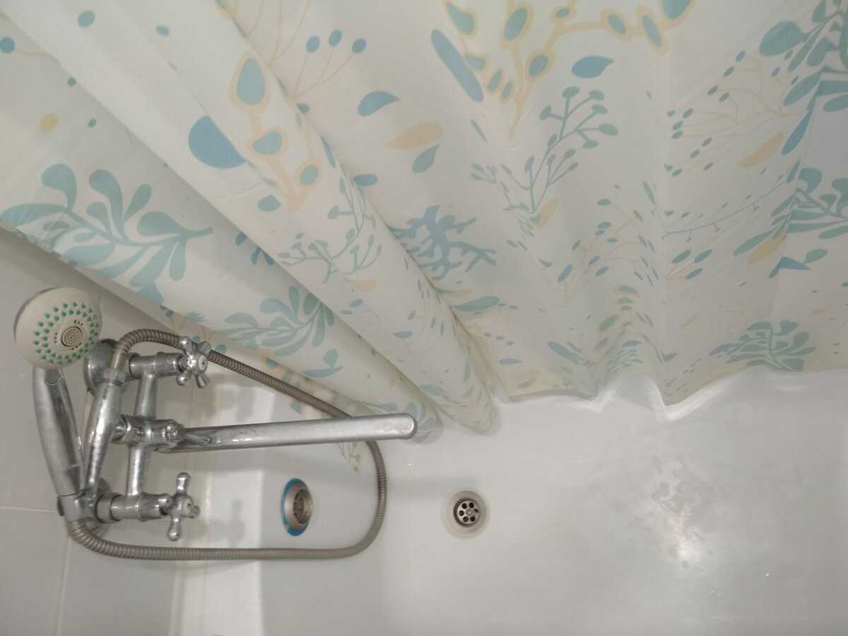 - шторку над ванной снимают и смачивают из лейки, после чего укладывают в пустой таз;