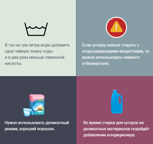 При наличии грибка на шторе, добавьте в воду небольшое количество хлорки. Также для устранения въевшихся старых загрязнений, при замачивании материала можете добавить к нему белизны.