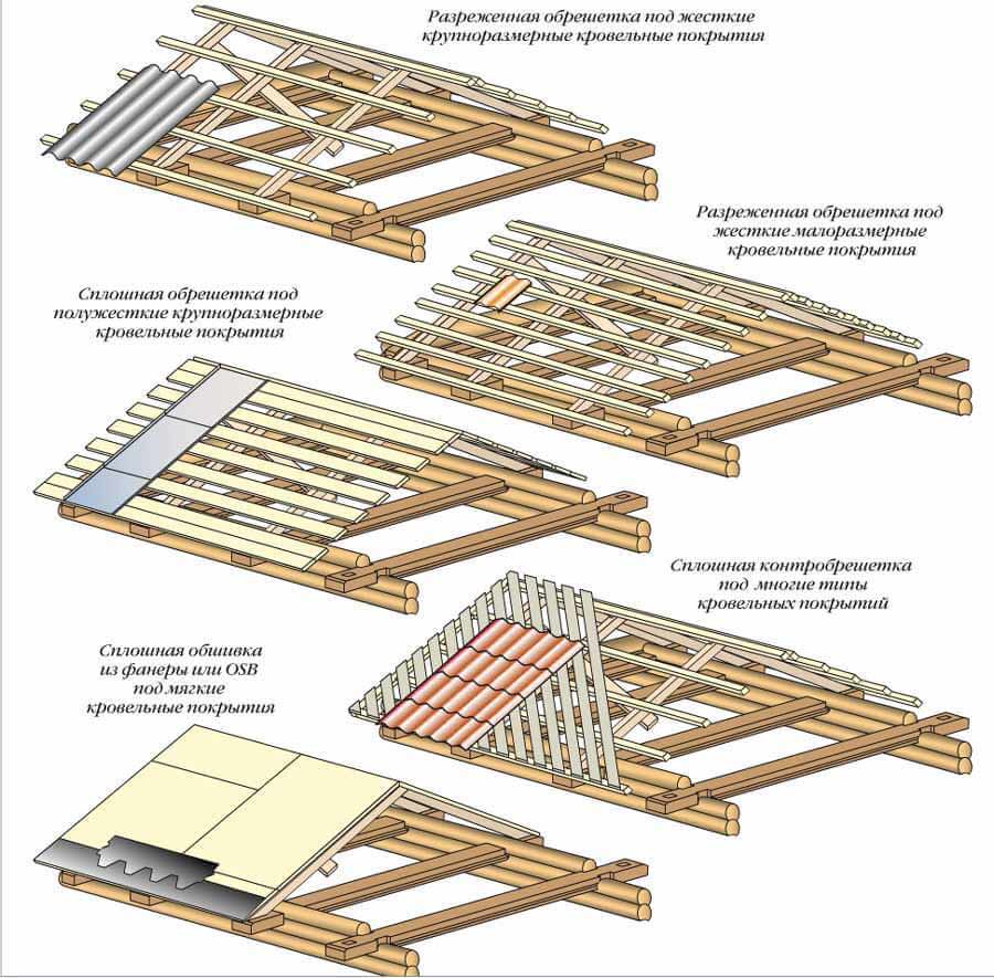 Учитывая, что настил крыши гаража чаще всего устраивается из рулонных материалов, логично использовать сплошную обрешетку по стропилам из обрезной, необрезной доски или фанеры.