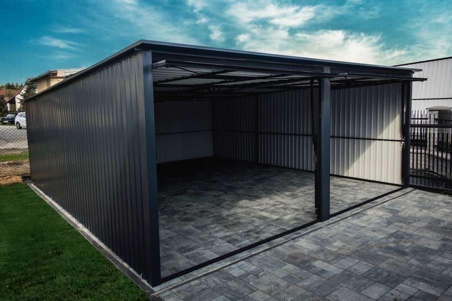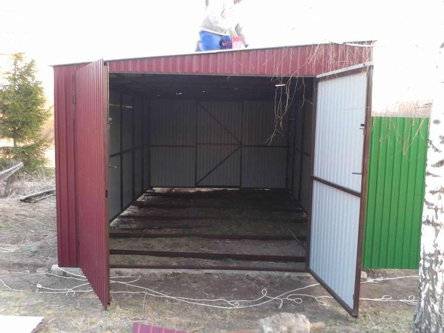 Вместительный металлический гараж рассчитанный на две машины. Располагается легкая конструкция на любой твердой поверхности. Основа постройки – каркас выполненный из профильных труб. Прочный металлический каркас обшивается профнастиллом.