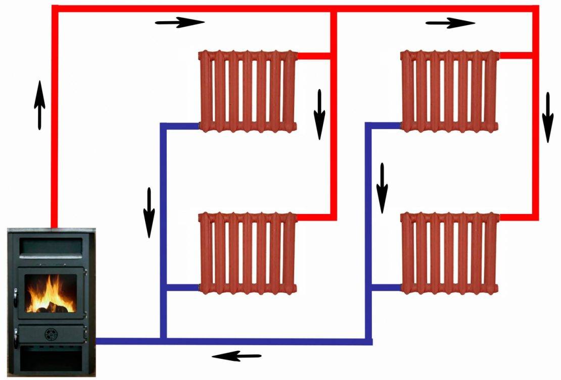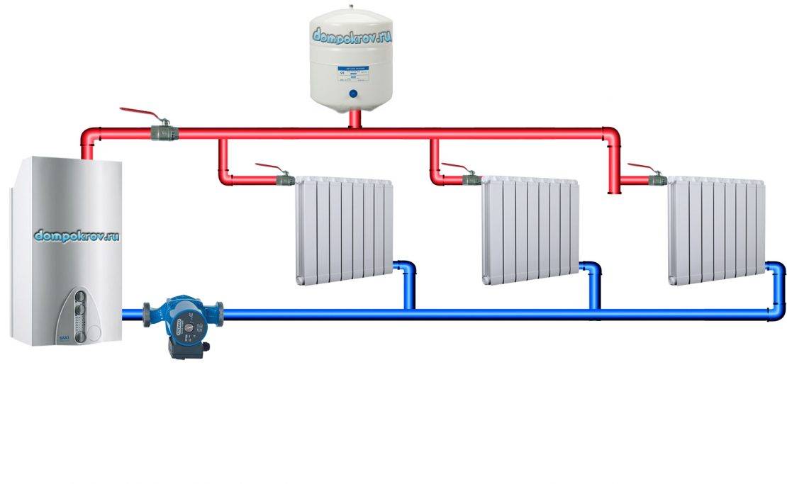 Прогретая жидкость поступает к радиаторам по одной отдельной трубе, а отводится по другой.