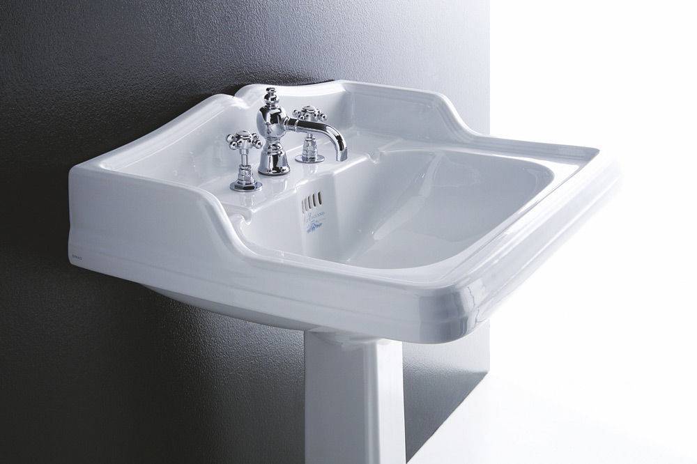 - С пьедесталом. Такие модели сочетаются с классическими интерьерами. На горизонтальное основание ставится массивный постамент, на который опирается чаша. Опора также маскирует инженерные конструкции.