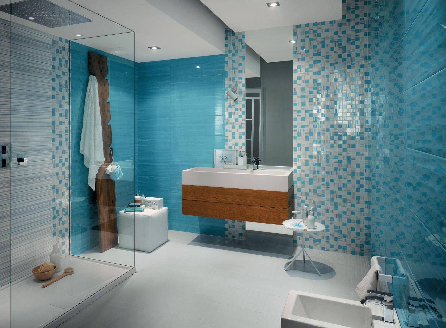 Помимо керамической плитки также доступна стеклянная плитка. Она бывает в виде мозаики, настенного декора или большого панно. Стеклянная плитка в основном используется для отделки стен и в качестве корпуса для сантехнических приборов. Чаще всего имеет глянцевую поверхность и ее легко содержать в чистоте. Плитка не впитывает воду, поэтому хорошо подходит для ванных комнат и кухонь. Высокое давление может повредить ее, поэтому стеклянную плитку на полах обычно не используют.