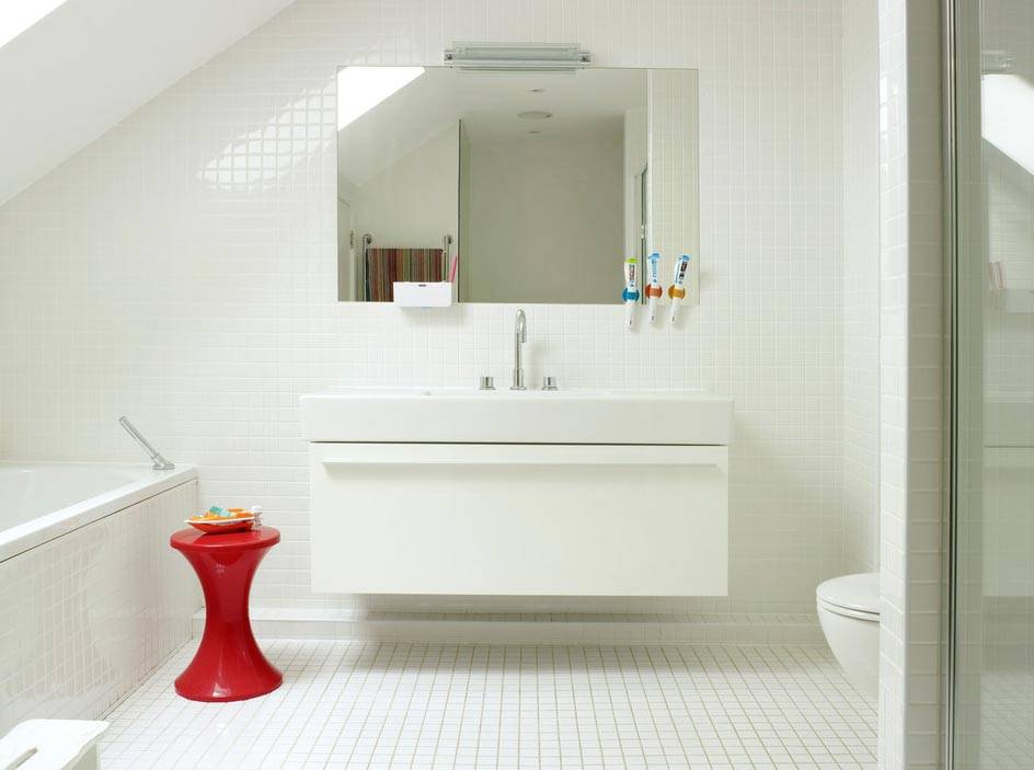 Красный позволяет сделать яркий цветовой акцент. Подходит для оформления одной рабочей зоны, например, возле ванной, раковины или зеркала. Красную мозаику поместите и на саму ванную, поддон душевой кабины.
