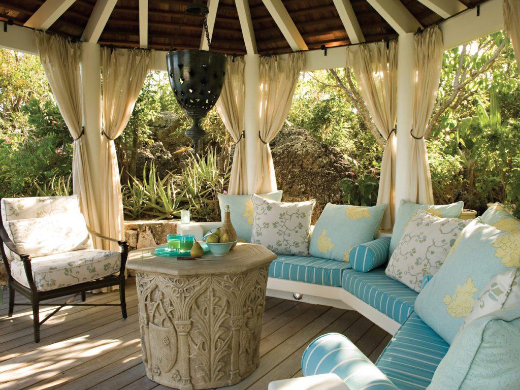 Для придания постройки более благородного и привлекательного внешнего вида, рекомендуется правильно продумать ее внутреннее обустройство. Вместо деревянного ограждения можно использовать тканевую тюль. Она придаст постройке воздушности, романтичности и эстетичности. К тому же, ткань прекрасно защитит место отдыха от проникновения избыточного количества дневного света.