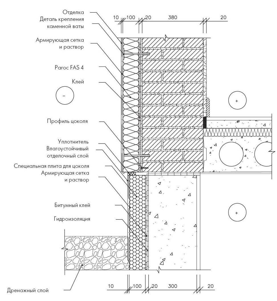 В случае, если утепление производится плитами из минеральных утеплителей – каменной или базальтовой ваты по штукатурной системе, необходимо на высоту 450–500 мм защитить участок гидроизоляционным составом из сухих строительных смесей.