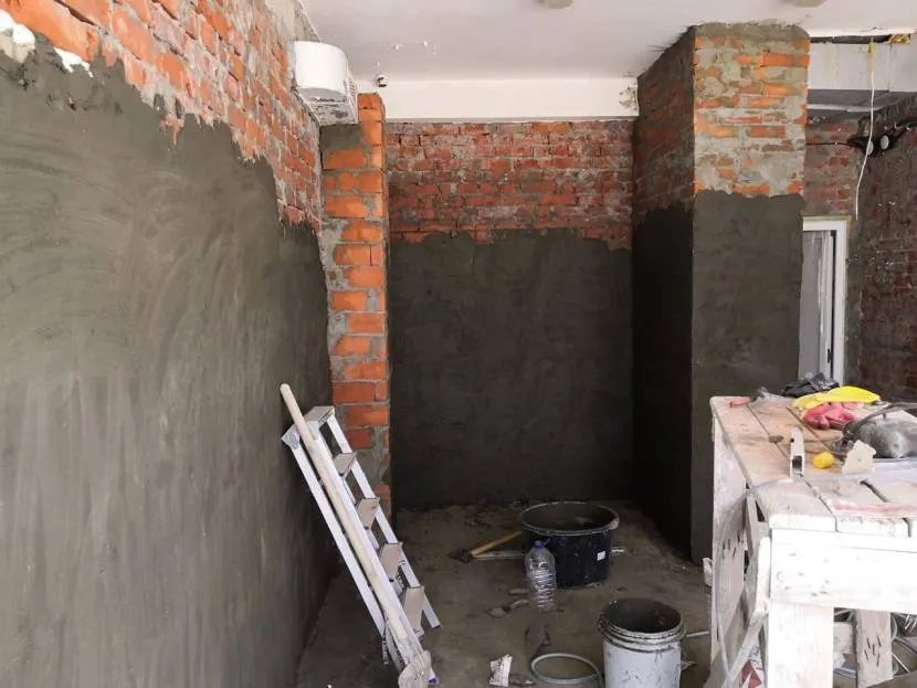 Все загрязнения зачищаются, щели расширяются и заделываются – в работе используются шпатель, наждачная бумага, строительные смеси (например, Изостоп). Осмотру/ремонту подвергается и нижний сегмент стены (в процессе гидроизоляции должны образоваться бортики, поэтому нужно позаботиться о подготовке). После этого проводится повторная уборка.