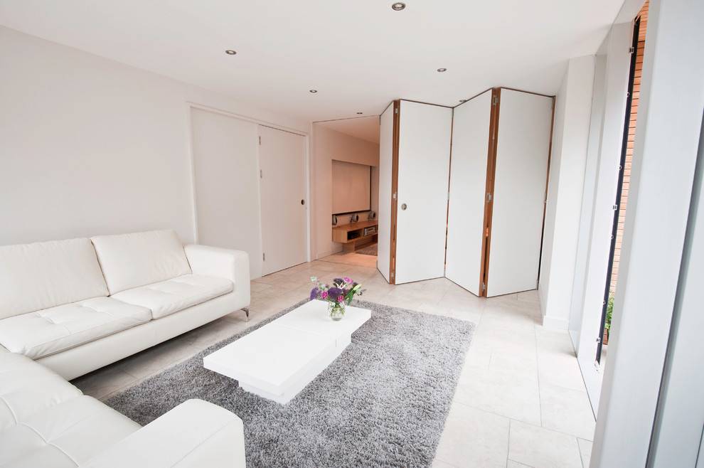 Раздвижная перегородка — самая простая в установке, для нее не требуется долгих монтажных работ, однако, она также уступает другим конструкциям прочностью и звукоизолирующими свойствами. Большинство подобных перегородок создаются из дерева и стекла, что придает обстановке эстетики, но не добавляет комфорта. Конструкции с карманом (выдвижной дверью) гораздо тоньше всех остальных, в этом и заключается ее основное преимущество, однако она также не обладает достаточными звукоизоляционными свойствами.