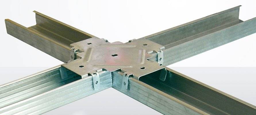 Из оставшихся кусков профиля делают продольный дополнительный каркас. Отрезки соединяют с профильным основанием под углом в 90 градусов, получаются четырёхугольники. Крепятся части с помощью специальных замков. Если потолочным покрытием будет гипсокартон, то крепление дополнительной обрешётки к основному каркасу происходит за счёт специальных крабов. Скрепляющие элементы надевают сверху основного профиля, затем прикладывают дополнительные куски обрешётки, загибают половинки краба и соединяют их саморезами.