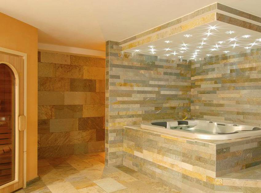 Существует множество разновидностей плитки, подходящей для использования в банях, саунах, хаммамах. Среди них можно выделить огнеупорные, жаропрочные керамические изделия, прекрасно подходящие для отделки нижней части стен и облицовки печи. Интересно выглядит плита под камень в отделке пола, впрочем, красивые натуральные минералы и горные породы сегодня тоже продаются в виде штучных изделий, стоят не слишком дорого. Ярким примером такой доступной отделки можно назвать талькохлорит и змеевик.