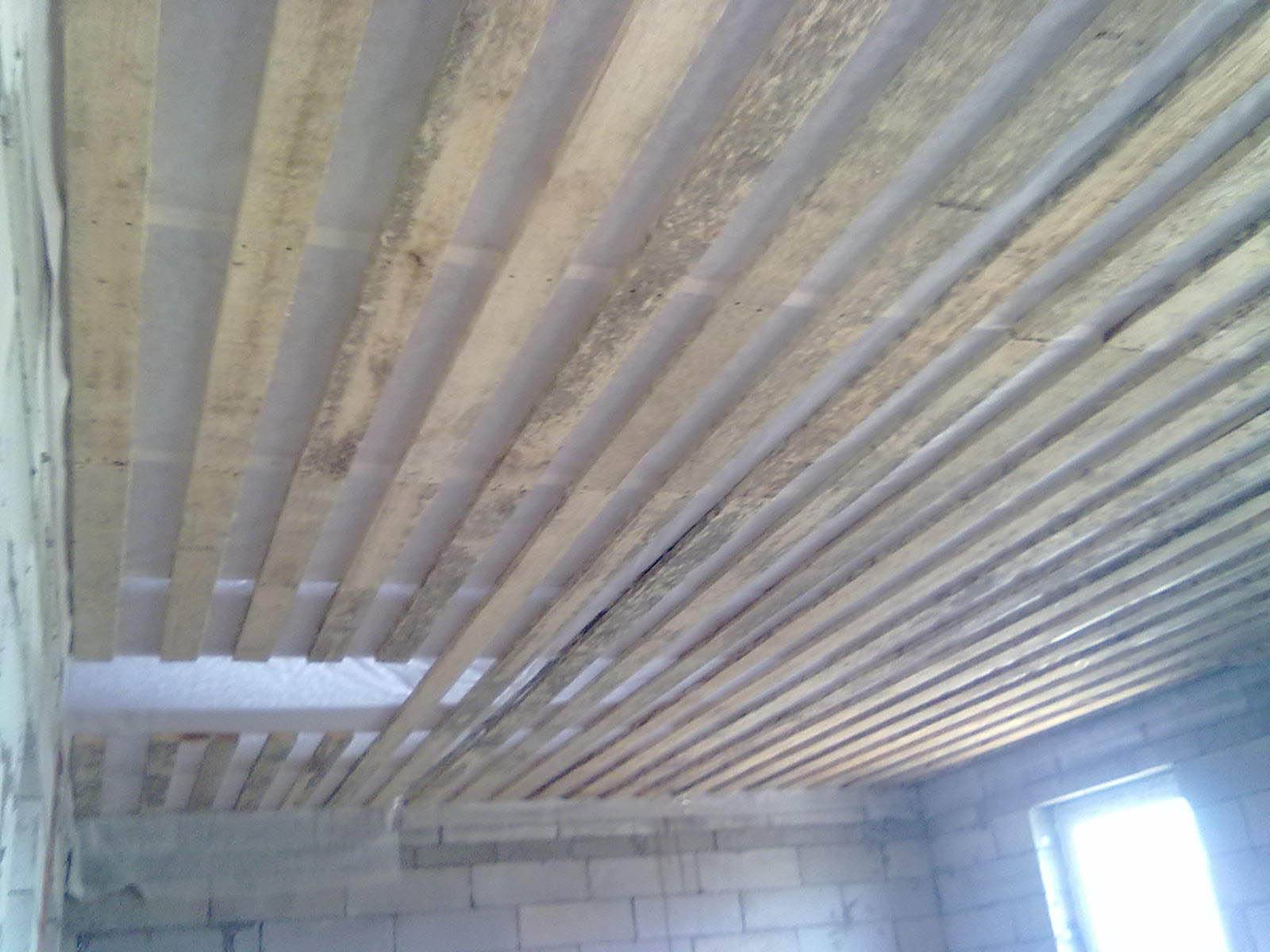 Наверное, самый распространенный вариант, полюбившийся многим за его прочность и безопасность. К уже смонтированным балкам подшивается выбранный древесный материал снизу, а свободное пространство между ними обильно заполняется утеплителем с обязательными слоями гидро и пароизоляции (читать об этом подробнее в статье: “Чем утеплить потолок в бане – выбор материала”).