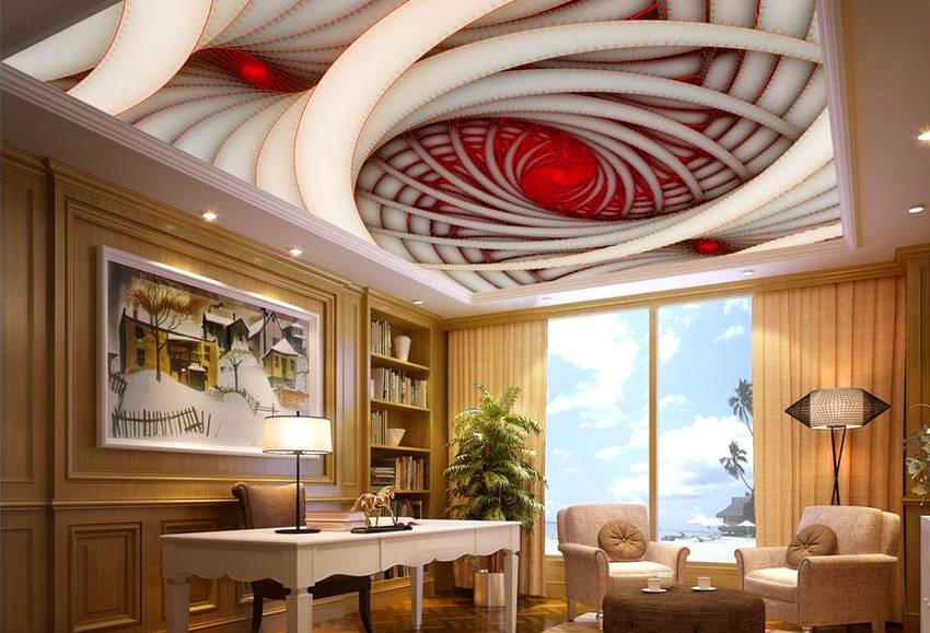 Для создания такой конструкции допускается применение любых отделочных материалов или использование нескольких вариантов отделки в комбинации. Распространенным является гипсокартонный потолок с вставками из натяжных полотен или зеркальных панелей. Дополнительно декорируют поверхность обоями, декоративной штукатуркой, художественной росписью или гипсовой лепниной.