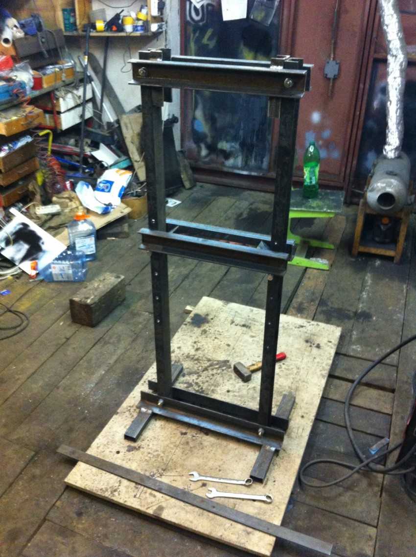 Создать классический ручной пресс из домкрата довольно просто. Сначала из толстого швеллера изготавливается рама. Ее угловые части усиливаются стальными листами, которые повышают прочность всей конструкции.
