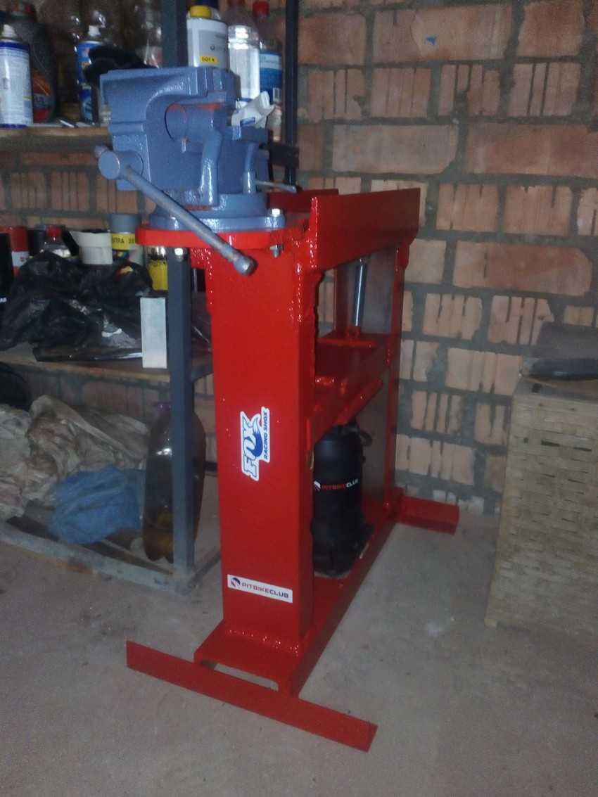 Оборудование использует для сжатия гидравлический автомобильный домкрат, который жестко крепится на поперечины станины из стального профиля. Для работы устройства требуется несколько раз качнуть рычагом, обратный ход осуществляется пружинами после открытия клапана.