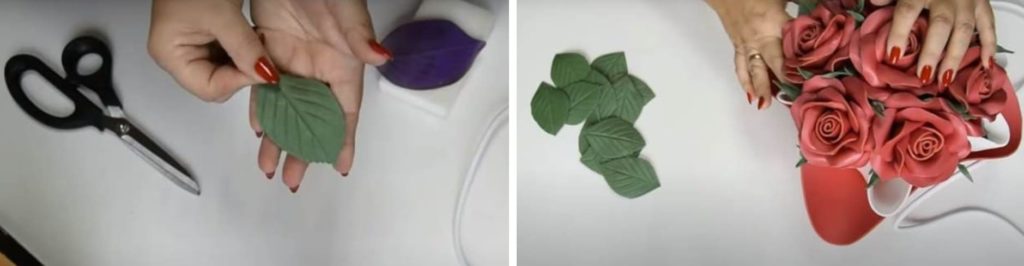 Для изготовления листьев понадобится зеленый изолон толщиной 2 мм. Его необходимо нарезать на квадраты со сторонами 6 см*6 см. Каждый квадратик прогревается над феном, укладывается на молд для отпечатывания узора, остужается, а затем на нем с помощью ножниц вырезаются зубчики. На лицевую сторону листиков наносится клей и листики приклеиваются под розочки.