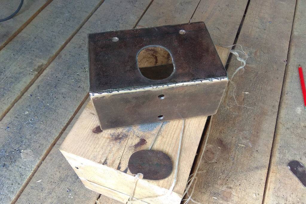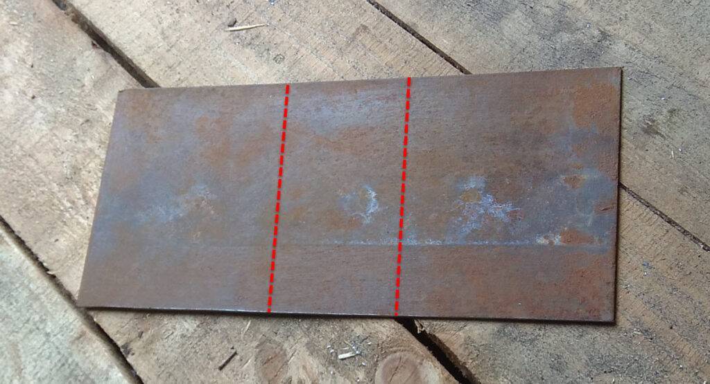 На подготовленной пластине из металла размером 330х180мм разметил места сгибов. Чтобы было проще согнуть пластину толщиной 3мм при помощи болгарки сделал по разметке надрезы. После сгиба пластины дополнительно проварил сгибы сварочником и обработал наждачной бумагой.