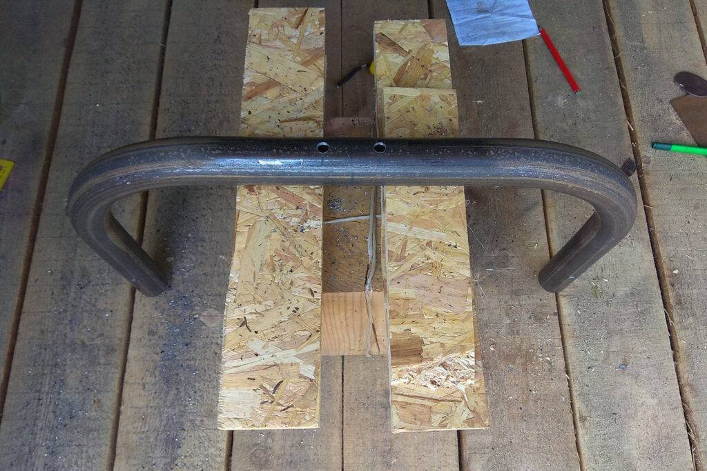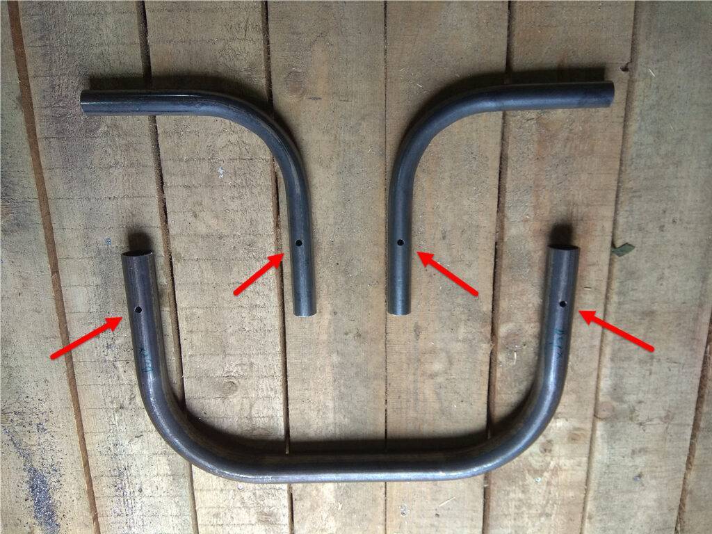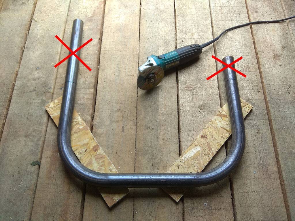 - между расходящимися профилями приваривается поперечная круглая труба (75 см), к ее концам приваривается еще пара обрезков по 20 см с незначительным уклоном вниз (будут служить ручками тренажера);