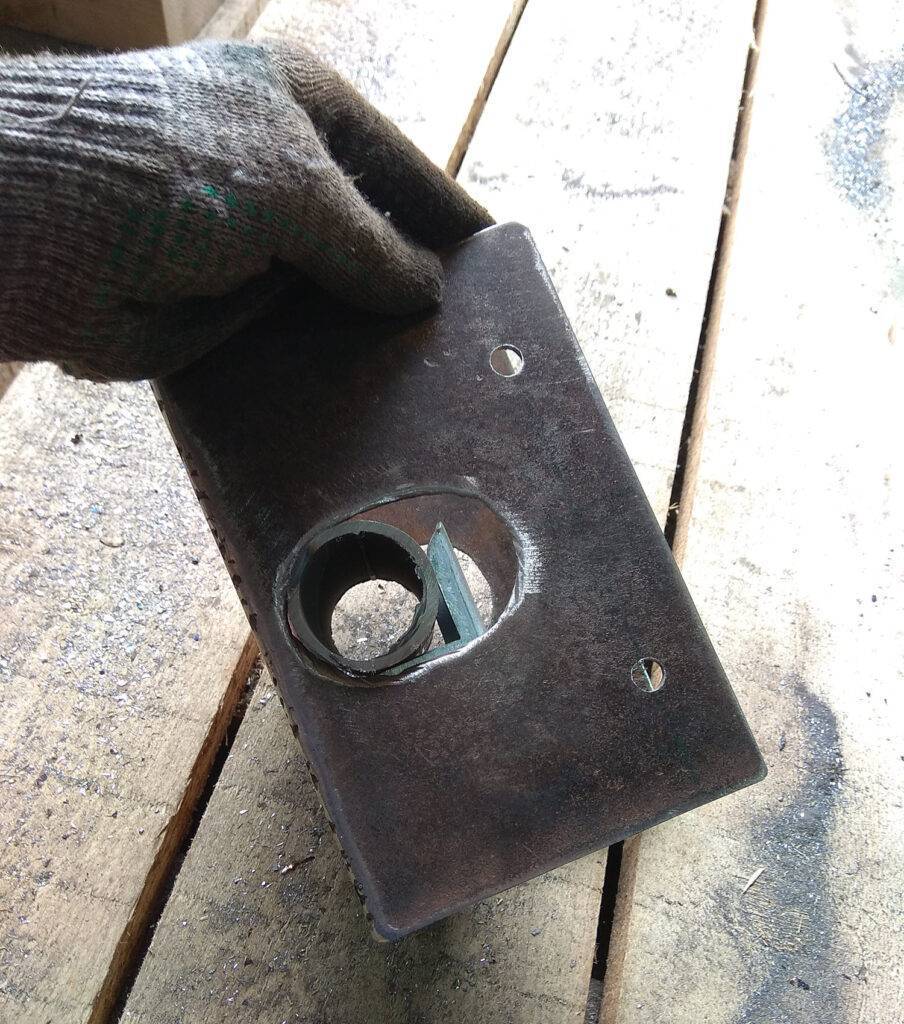 Изначально планировал все детали вставки согнуть из стального листа, но решил переделать готовое изделие “Держатель для балки 80х120х2мм”, чтобы сделать ограничитель для вставки. Это связано с тем, что лист толщиной 3 мм очень тяжело сгибать и я решил облегчить себе задачу. (Вывод: лучше использовать стальной лист толщиной 2 мм, легче будет его согнуть)