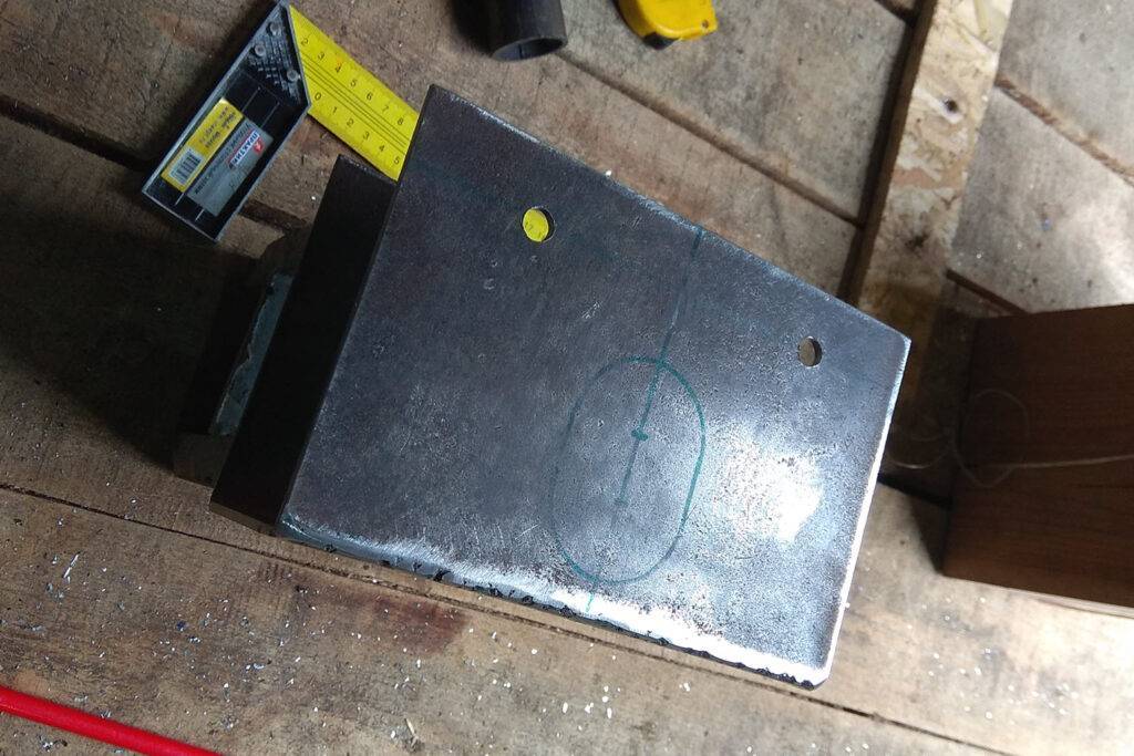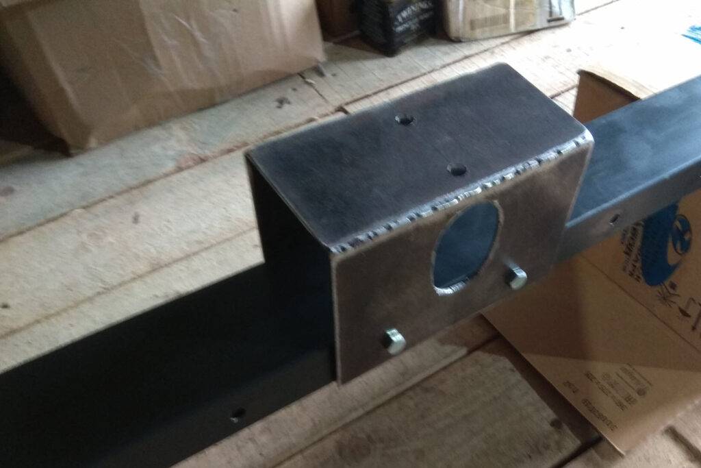 У держателя балки 80х120х2мм отпилил лишние части, как показано на фото ниже. Все размеры подогнал по месту. Также просверлил два отверстия диаметром 11 мм для установки болта М10.