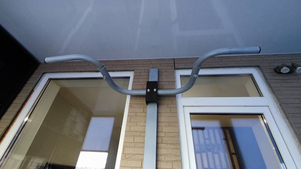 Наддверные конструкции — одни из самых компактных. Меньше места занимают только те, которые устанавливаются в дверном проеме или между двух близкорасположенных стен (тут вообще нужна только труба, под которую сделаны особые крепления).