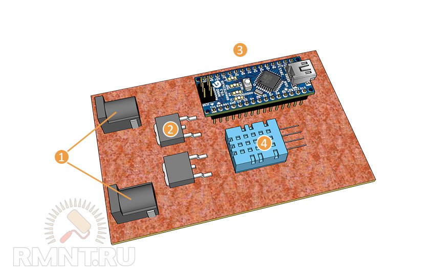 1. Разъемы питания. 2. Ключевые транзисторы. 3. Плата контроллера Arduino. 4. Датчик влажности