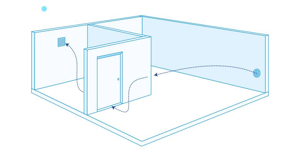 - Внутри комнаты скапливаются пыль и переработанный воздух. Он удаляется из комнаты через установленную внутри помещения систему вытяжения воздуховода.