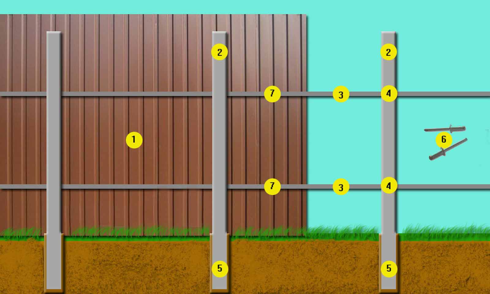 - Первыми устанавливаются опорные столбы, которые следует заглублять в почву на один метр либо более, при этом шаг должен составлять до двух с половиной метров. Продольные лаги надо крепить к уже установленным столбам, а профнастил монтировать в последнюю очередь при помощи оцинкованных саморезов. Нельзя применять простые алюминиевые заклепки, так как они не обладают должной прочностью и надежностью.