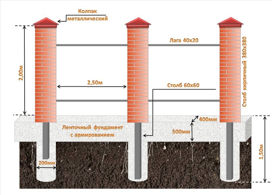 - Ленточный фундамент дорогой в исполнении. На почвах с дренажем делают фундамент малого закладывания. Пучнистые земли требуют глубинного вскапывания. Даже если лента предполагается узкая, копать придется много. По длине ограждения роют траншею, устанавливают опалубку, вяжут арматуру, заливают и отделывают. Кирпичные столбы ставят сверху.