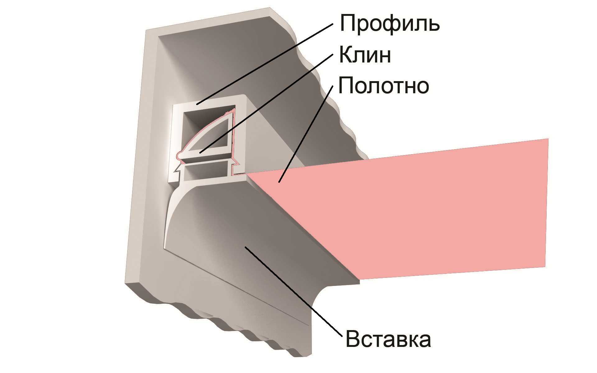 Штапиковая или клиновая замковая система крепления подходит для установки полотен из ПВХ пленки и полиэстеровой ткани. Однако для установки в такой багет по краю полотнища должен быть припуск для натяжения материала. После монтажа он обрезается, поэтому повторно установить ткань или пленку в такую систему фиксации не получится.