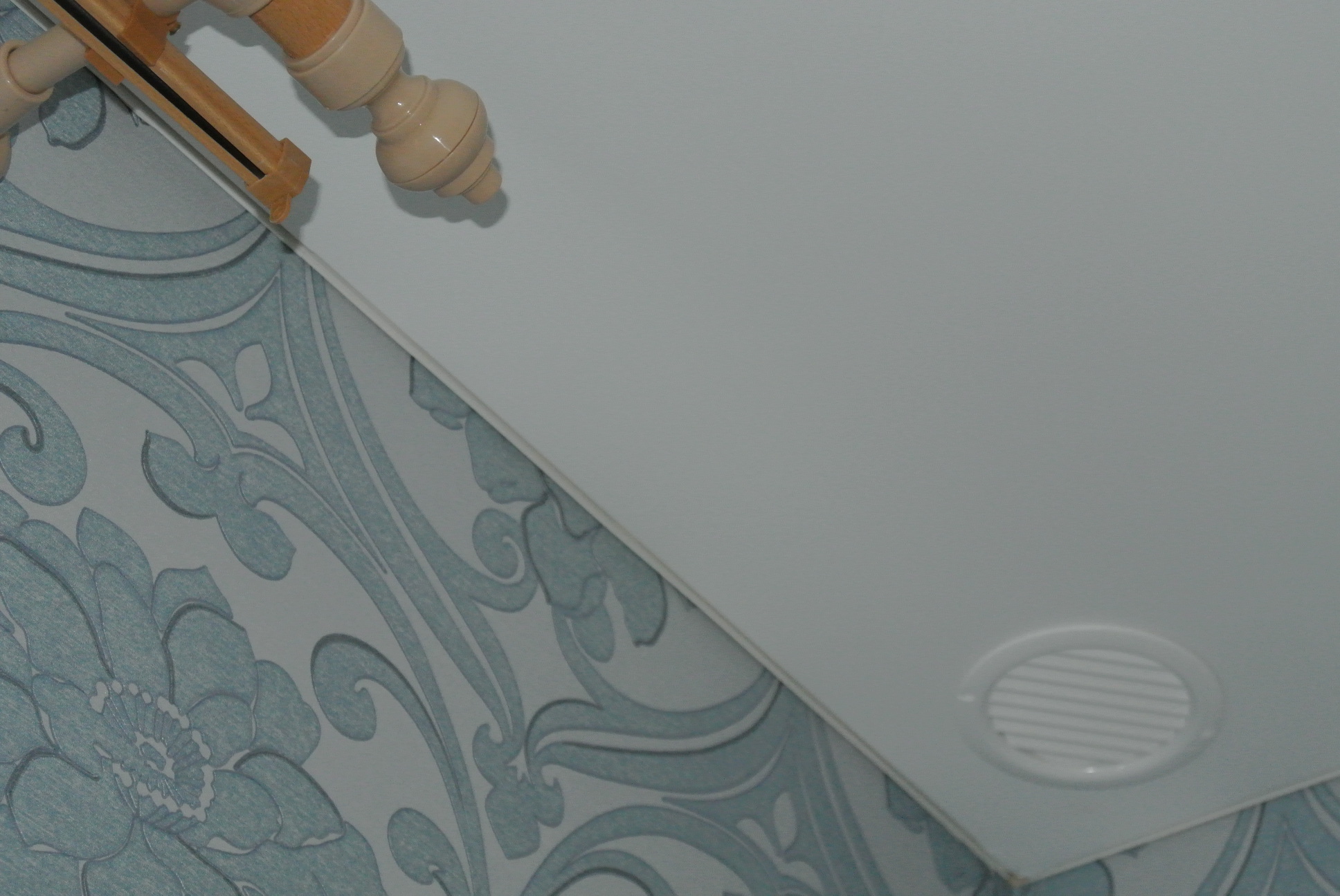 - Частичный демонтаж понадобится при затоплении сверху. Если высвободить край полотна из багета, то можно легко слить воду с ПВХ покрытия и просушить запотолочное пространство. После этого провисшее покрытие разогревается тепловой пушкой и обратно заправляется в багет.