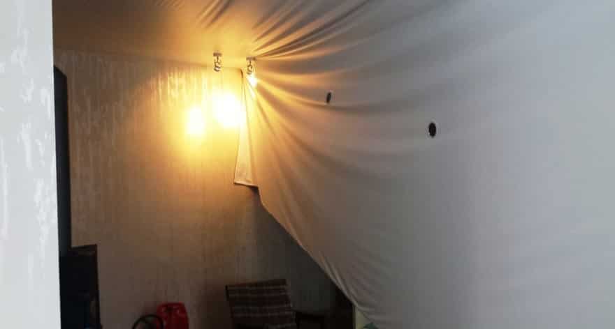 В случае потопа демонтируйте светильники и при помощи шланга слейте воду с потолка. Хорошо его просушите и верните осветительный прибор на место. Если светильников в потолке нет, то придется отсоединять край или угол материала.
