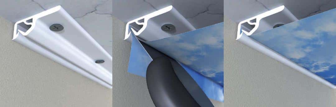 - Клипсовый. Разработан специально для ткани, фиксирует материал по принципу прищепки. Полотно заводится в профиль петлёй и удерживается за счёт трения. Излишки материала после монтажа обрезаются. Поэтому установить потолок назад не получится, можно только заказать новую ткань (с запасом на монтаж).