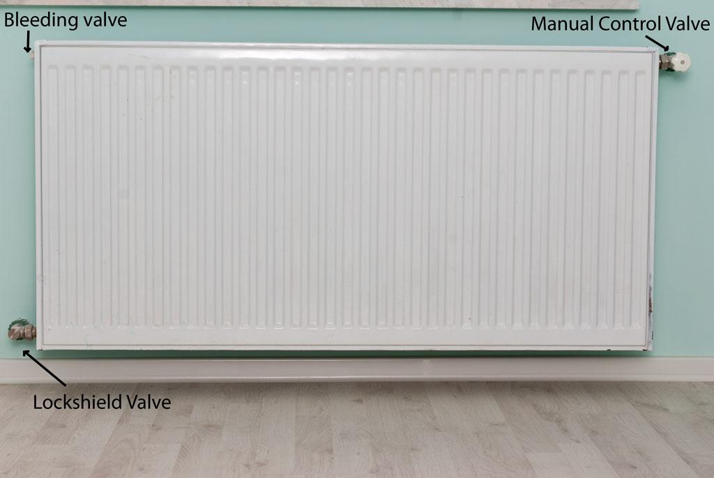 Прежде всего мы должны показать Вам главные элементы радиатора: справа вверху — регулировочный вентиль, внизу слева — запорный вентиль (для регулировки подачи воды), слева верх — кран Маевского для спуска воздуха из радиатора отопления.