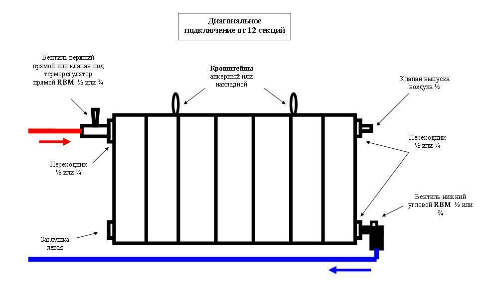 В таком случае обеспечено диагональное прохождение теплоносителя через всю батарею и равномерный её нагрев. При количестве секций в радиаторе около 15, система работает оптимально.