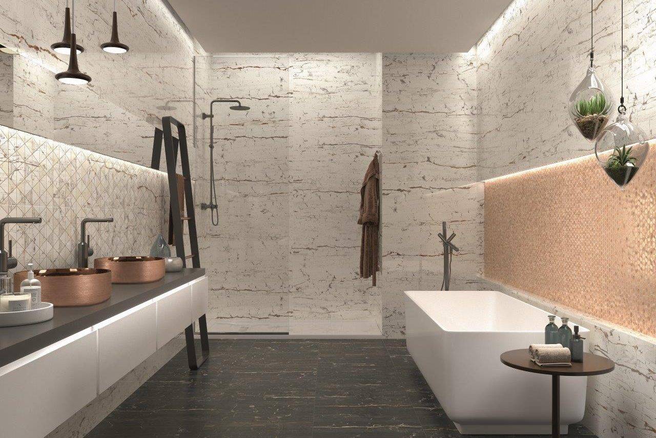 Искусственный керамогранит является одним из наиболее подходящих напольных и настенных покрытий для ванной комнаты. Выбор форматов, видов и цветов огромен. Это материал, который лучше всего противостоит брызгам воды благодаря своим искусственным свойствам, и, в отличие от большинства натуральных плиток, керамогранит также очень устойчив к химическим веществам в большинстве чистящих средств, которые регулярно используются в ванных комнатах.