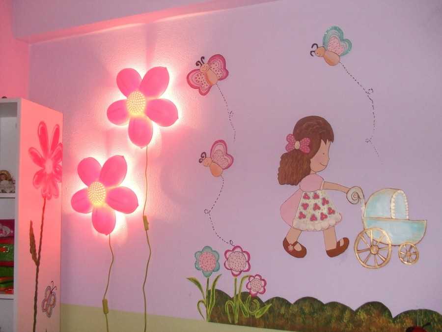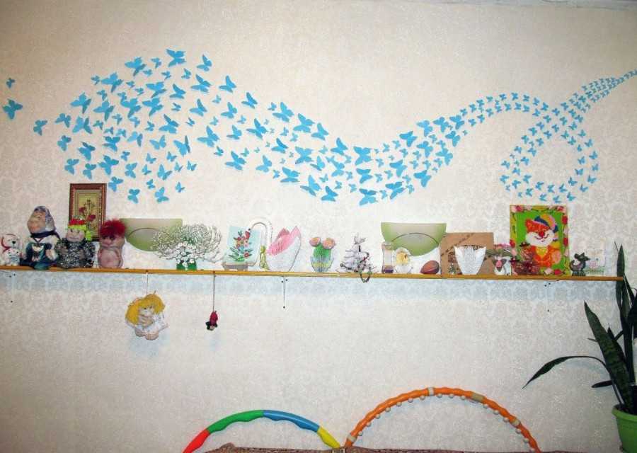Огромные цветы из гофрированной бумаги станут украшением для стен, придав им модный формат 3D. Также стены можно оформить аппликацией из бумажных птичек или бабочек либо просто вырезать из бумаги разнообразные фигурки и развесить их по периметру комнаты.