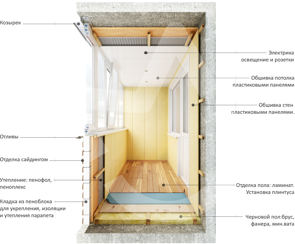Вот пример недорогого и одновременно практичного отделочного комплекта. Изнутри стены и потолок обшиваются гипсокартонном. Он монтируется на металлический профиль, что даёт дополнительную воздушную камеру. На пол отлично ложатся ламинат или керамическая плитка. Снаружи балкон можно обшить сэндвич-панелями из ПВХ.