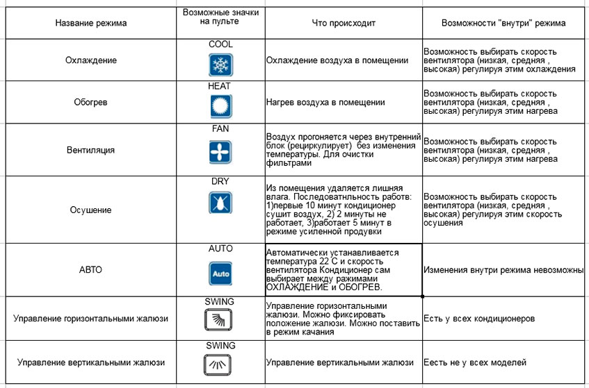 - Зачастую на пультах нет кнопки Mode. В этом случае следует поискать на пульте графические обозначения в виде «снежинки», «вентилятора», «капельки» или «солнца».