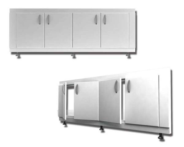 Экраны представляют собой достаточно простую конструкцию, которая состоит всего из нескольких элементов: каркаса, панелей и дверок. Но не смотря на незамысловатость конструкции это изделие отлично справится со своими функциями: