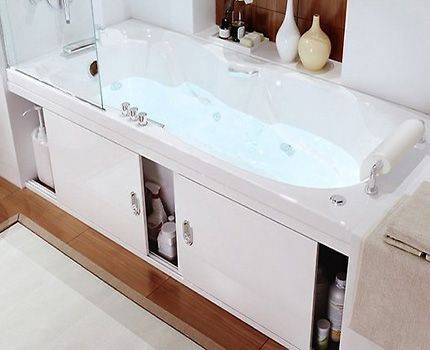 Так называется экран для ванны с дверками, которые закреплены на петлях и открываются привычным способом, как и все двери. Основой служит каркас из металла, пластика или влагоустойчивого бруса. Эта конструкция наилучшим образом подходит, если необходимо организовать экран под ванну с полками. Кроме того, распашные дверцы позволяют без труда добраться до расположенных под ванной коммуникаций, если потребуется их ремонт или замена. Но для маленького помещения экран с дверцами под ванну может оказаться функционально неудобным: для распашных створок требуется свободное пространство, которого в стесненных условиях всегда не хватает.